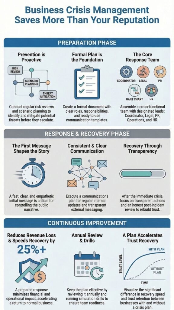 Crisis management is the practice of expecting disruption. It assumes that a supplier will fail, a system will go down, a public issue will spread fast, or a key person will suddenly be unavailable. The goal is not to predict every problem. It is to be ready. Prepared organizations recover faster and keep more revenue because they do not panic.